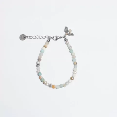 DESCRIPCIÓN 💎 Pulsera de piedra facetada amazonita con alitas de acero colgando. ¡Un modelo súper delicado, ideal para acompañarte todos los días con estilo y alegría!