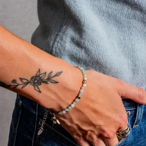 COMPOSICIÓN 🛠️ Hecha de piedra amazonita y acero quirúrgico, esta pulsera es hipoalergénica y resistente al agua, para que puedas lucirla con total confianza en cualquier ocasión. 💧