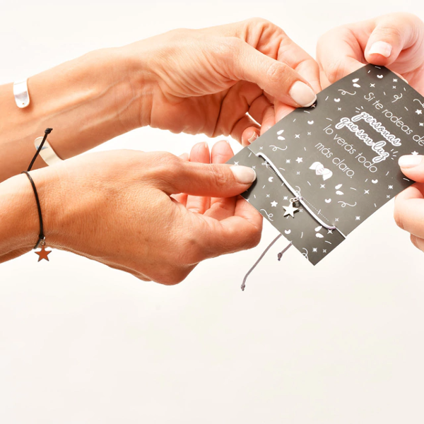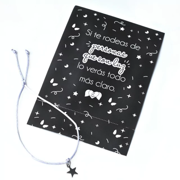 Pulsera ajustable de hilo de seda y dije de estrellita de acero. 🎁Regalo perfecto para todas tus amigas y personas queridas. Disponible en negro o lavanda. 💡La tarjeta está pensada para que una vez saques la pulsera puedas guardarte la frase, y hasta podes agregar una dedicatoria en el dorso.