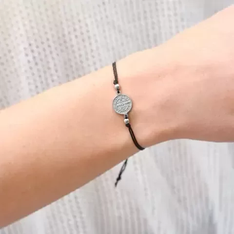 Pulsera de hilo ajustable, disponible en dos colores: negro y rojo, con dije de San Benito en acero quirúrgico. Es una opción perfecta para regalar. La medalla de San Benito es un sacramental, que la tradición indica que hay que regalárselo a la persona que queremos que este Santo proteja de cualquier mal.