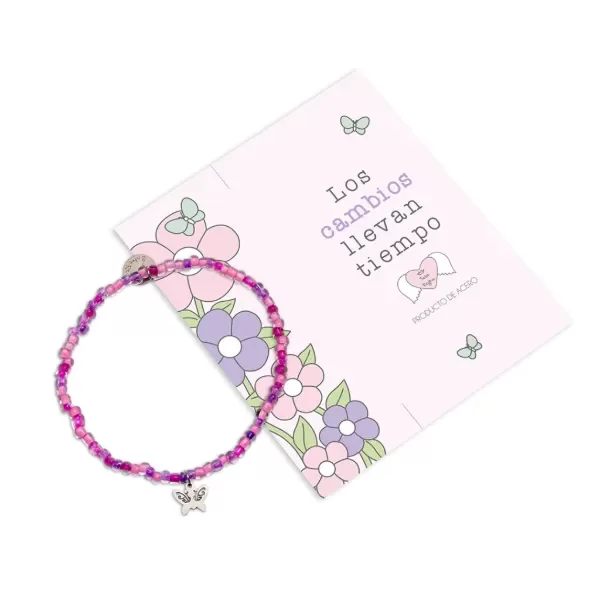 Pulsera elastizada de mostacillas en tonos de púrpura, con dije de acero con forma de mariposa. Acompañada de una hermosa tarjeta con frase "Los cambios llevan tiempo". Creamos esta pulsera para que puedas recordarte o recordarle a quien vos quieras, que todo es un proceso, y que lo importante es disfrutarlo. Todo aprendizaje o transformación lleva tiempo, al igual que la metamorfosis de las mariposas.