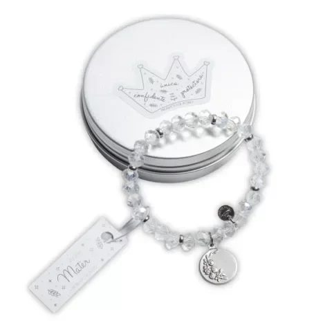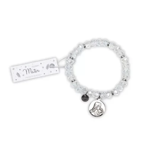Llevá siempre con vos un toque de espiritualidad con esta pulsera elastizada ✨. Diseñada con cristales facetados transparentes, cuentas de acero, y un hermoso dije de la Virgen con su hijo, es una pieza delicada y llena de significado. Ideal para regalar o para darte un mimo especial 🌟.