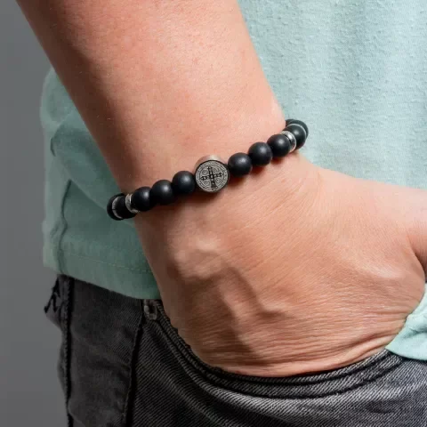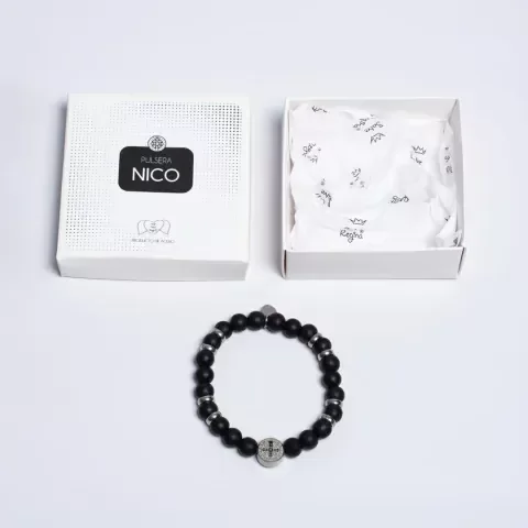 DESCRIPCIÓN Esta pulsera de fimo negro con separadores y un pasante de San Benito de acero en el centro es el accesorio perfecto para añadir un toque de elegancia y protección a tu atuendo. El fimo negro le da un aspecto moderno y versátil, mientras que el pasante de San Benito añade un toque espiritual significativo.