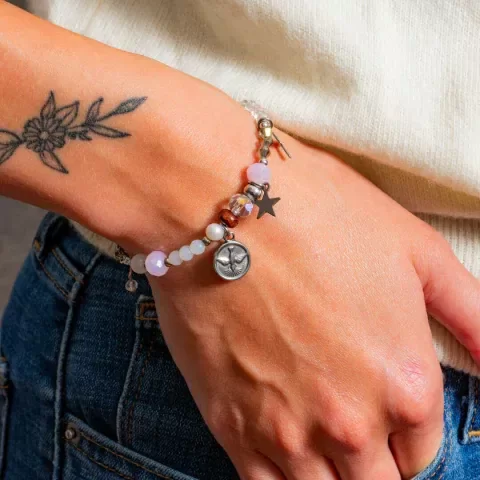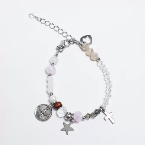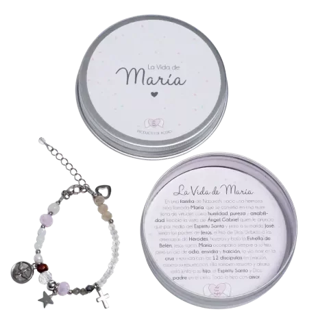 DESCRIPCIÓN 💖 Pulsera con cuentas de vidrio, acero y madera que narra a través de símbolos la historia de la vida de María.
