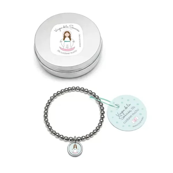 Pulsera elastizada con cuentas de acero quirúrgico y medallas de la Virgen Niña, Medalla Milagrosa o Virgen de la Sonrisa con diseño Xfis✨. Una forma tierna y original de sentirse protegido y acompañado. Viene en lata reutilizable con sticker especialmente diseñado para cada modelo.