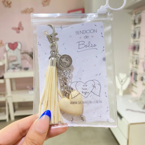 Bendición, ideal para colgar en bolsos, mochilas, carteras, cartucheras, llaveros, valijas, etc. Viene con un gancho y varios dijes de San Benito, Espíritu Santo y Angelito de la Guarda.