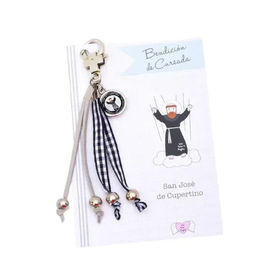 Bendición para colgar en bolsos, mochilas o llaves, con dije de San José de Cupertino, patrono de los estudiantes. Viene presentado en un packaging ideal para regalar🎁 con la oración: "Querido San Cupertino, Xfis ayúdame🙏, el estudio a veces me resulta aburrido. Tú puedes hacérmelo fácil y agradable. Yo te prometo un mayor esfuerzo y dedicación en mi cursada".