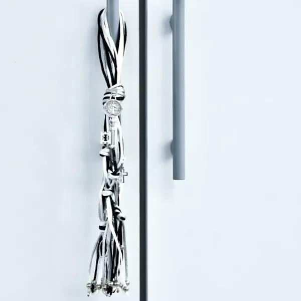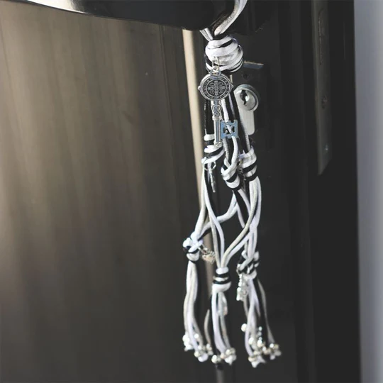 Bendición, ideal para colgar en el picaporte de una puerta, o detrás de ella con un clavito. Tiene dijes de San Benito, Sagrada Familia, Espíritu Santo, Cruz, Angelito de la Guarda y Corazón.