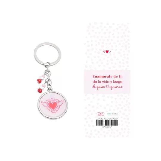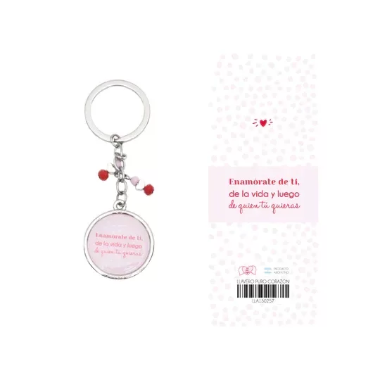 Llavero de aleación de metales con dije principal redondo de 3 cm. de diámetro con dijes de corazón y cuentas rojas y rosas. Viene presentado en un packaging ideal para regalar🎁. Los llaveros son complementos pensados especialmente para obsequiar y lograr transmitir un sentimiento que acompañe al agasajado todos los días✨.