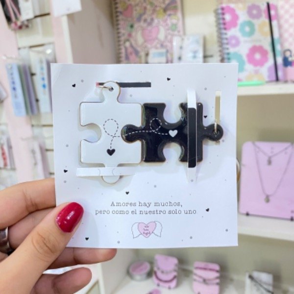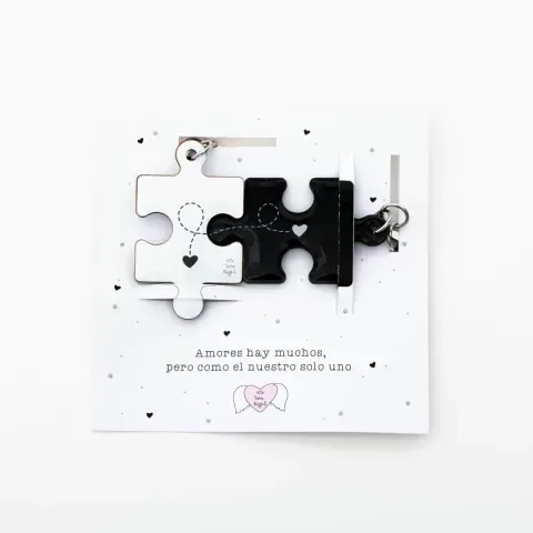 Par de llaveros con forma de pieza de rompecabeza que se encastran. Viene presentado en un packaging ideal para regalar🎁. Los llaveros son complementos pensados especialmente para obsequiar y lograr transmitir un sentimiento que acompañe al agasajado todos los días✨.